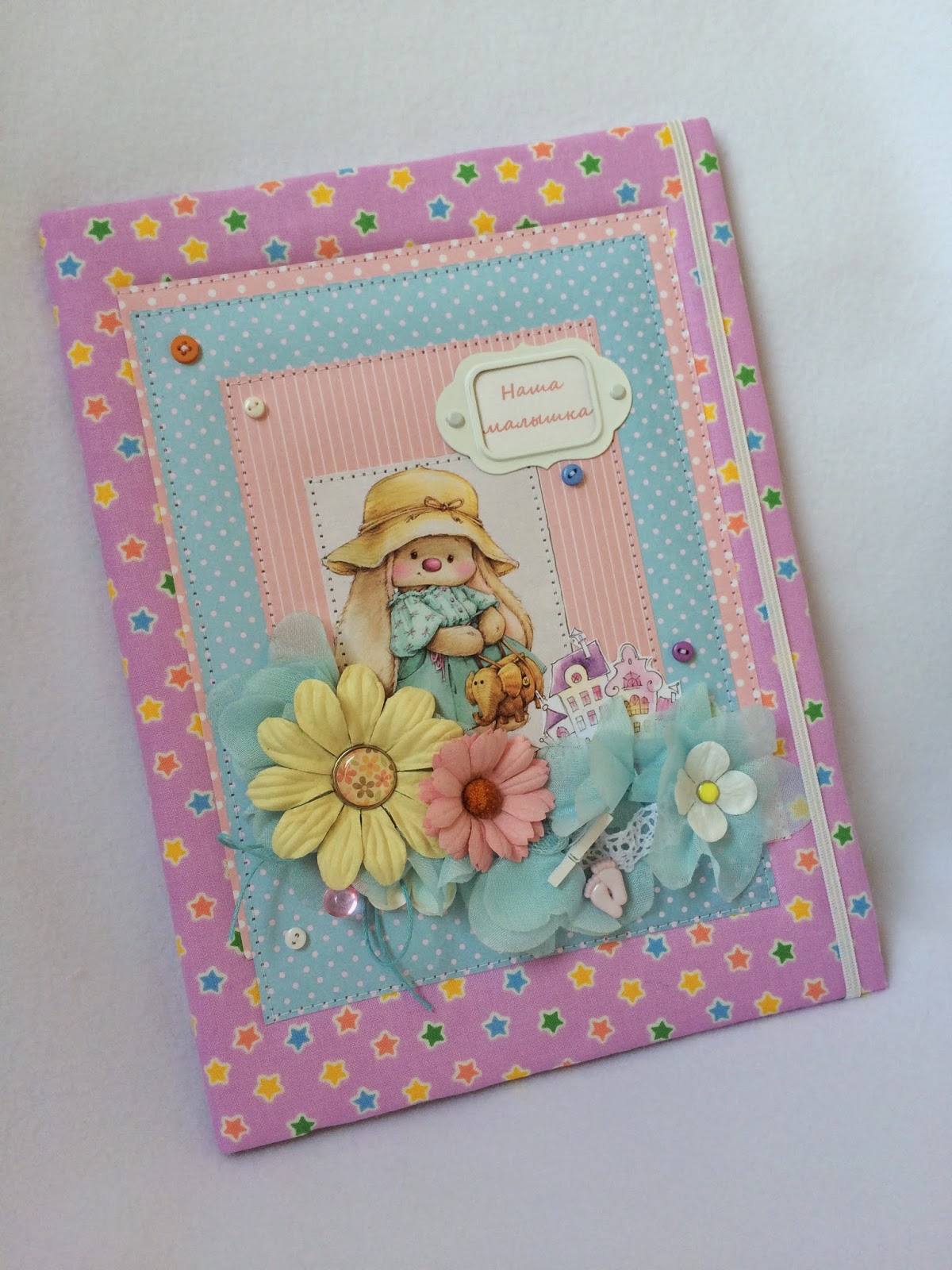 Сегодня хочу показать папочку для свидетельства о рождении для девочки. Папочка "сделалась" у меня просто так, не по заказу. Давненько купила набор тканей в звездочку и все они лежали и меня манили, такие они классные)) Решила хоть из пары кусочков что-нибудь сделать:) Сегодня, мучаясь головной болью и поэтому не желая никуда ходить, осталась дома и сотворила эту "зефирку". Внутри папки файл для свидетельства, который позволит надежно защитить документ от воздействия внешних факторов, а также кармашек для бирочек:) Работа выполнена из бумаги Scrapberry's. А еще, совершенно непредумышленно, получилась она в розово-голубой гамме, поэтому хочу с ней поучаствовать а Задании 28: палитра в блоге Scrapberry's.